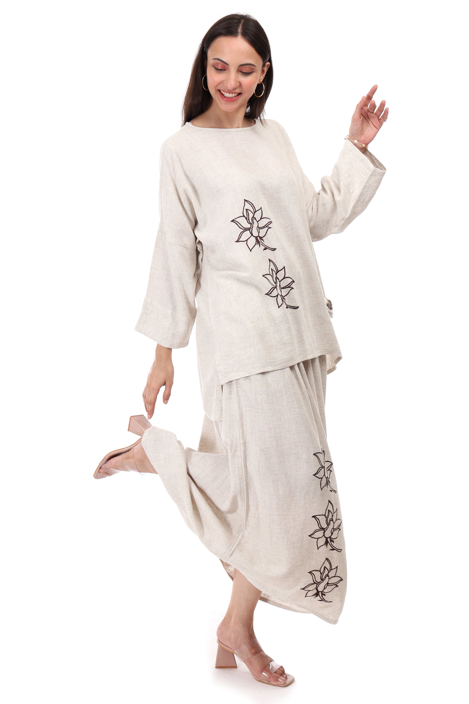 Huegenz Women's Beige Two-Piece Co-Ord Set in Viscose Linen with Floral Embroidery