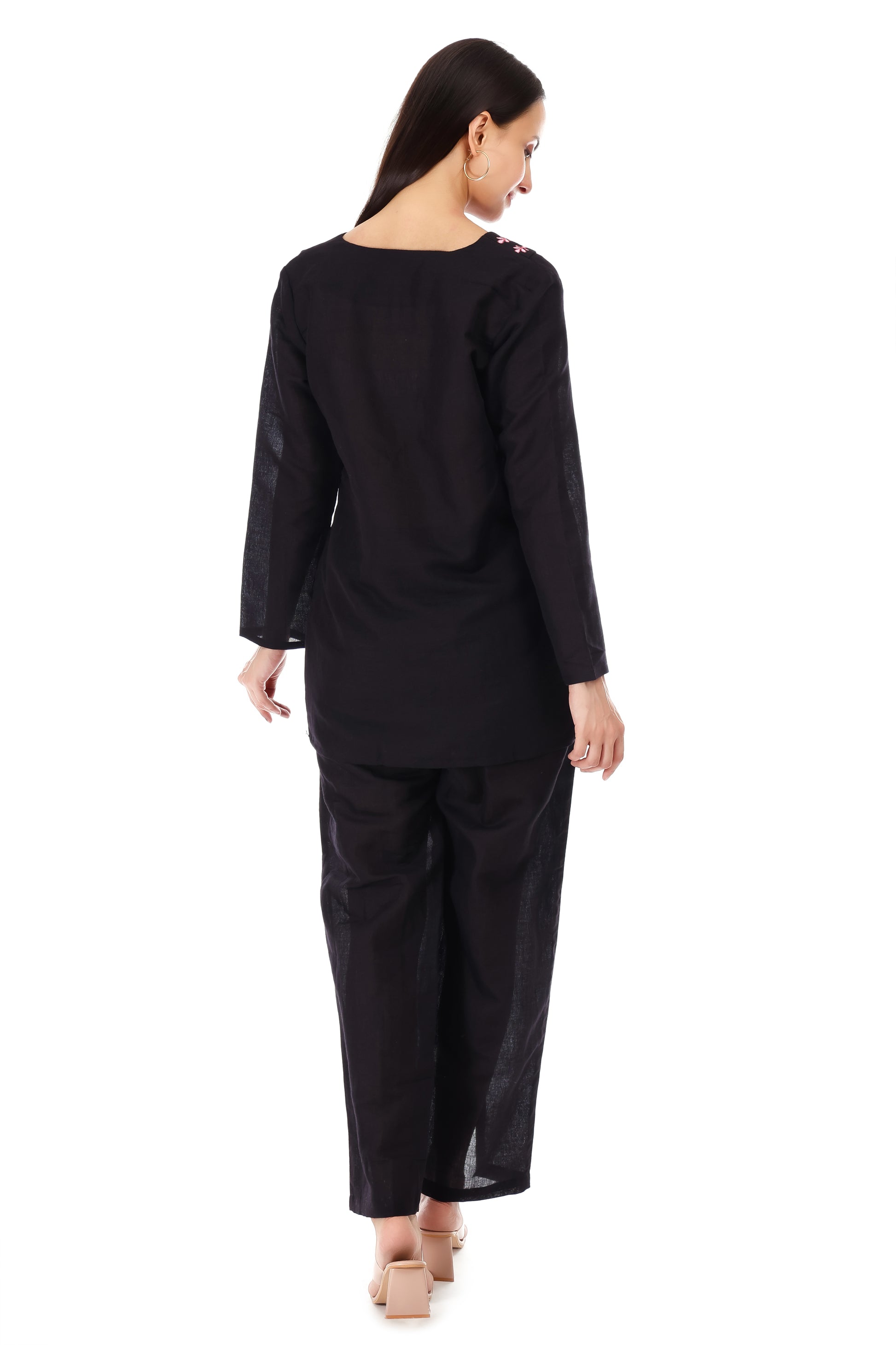 Huegenz Women's Black Two-Piece Co-Ord Set in Viscose Rayon with Floral Embroidery