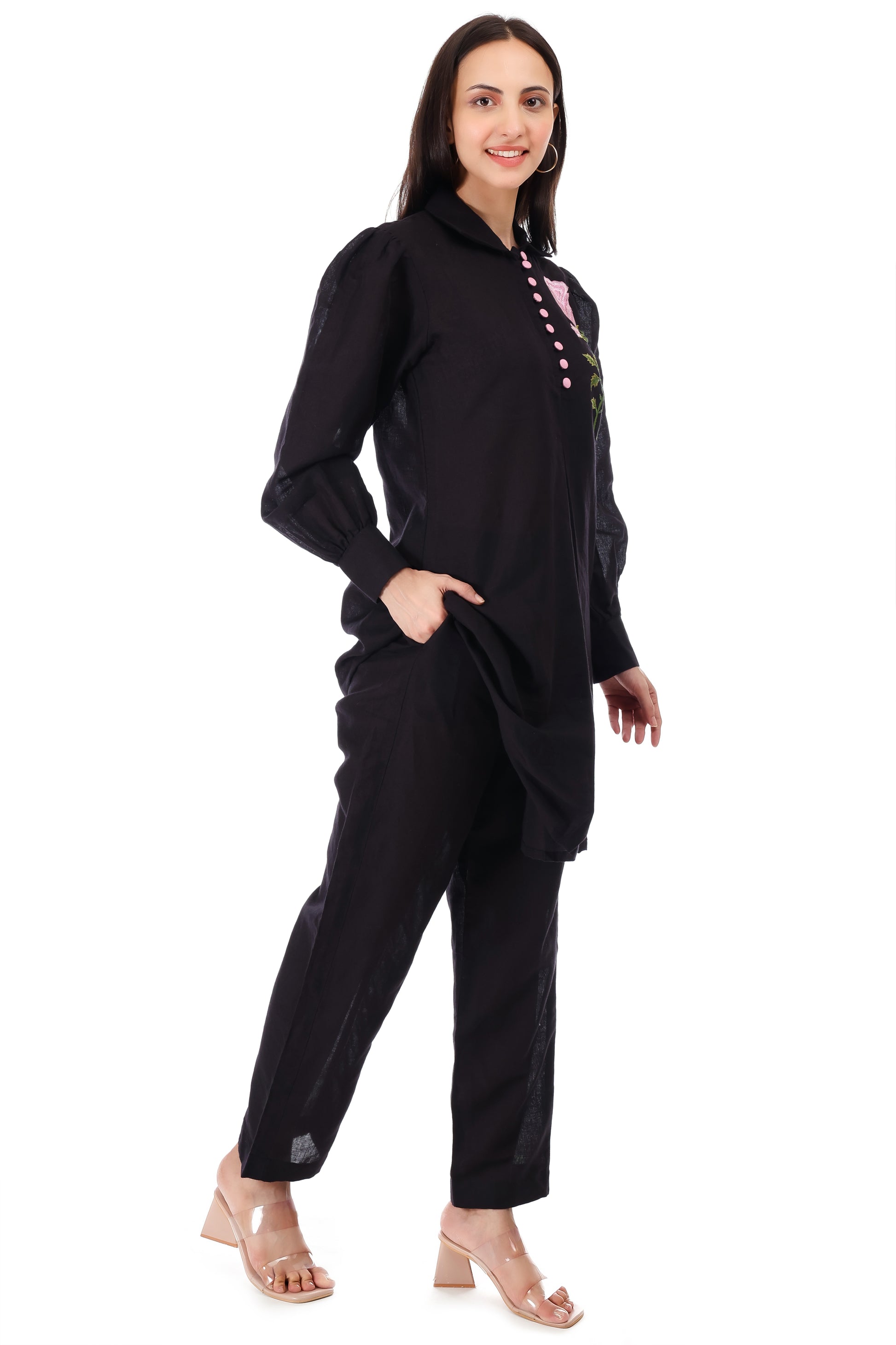 Huegenz Women's Black Two-Piece Co-Ord Set in Viscose Linen with Floral Embroidery