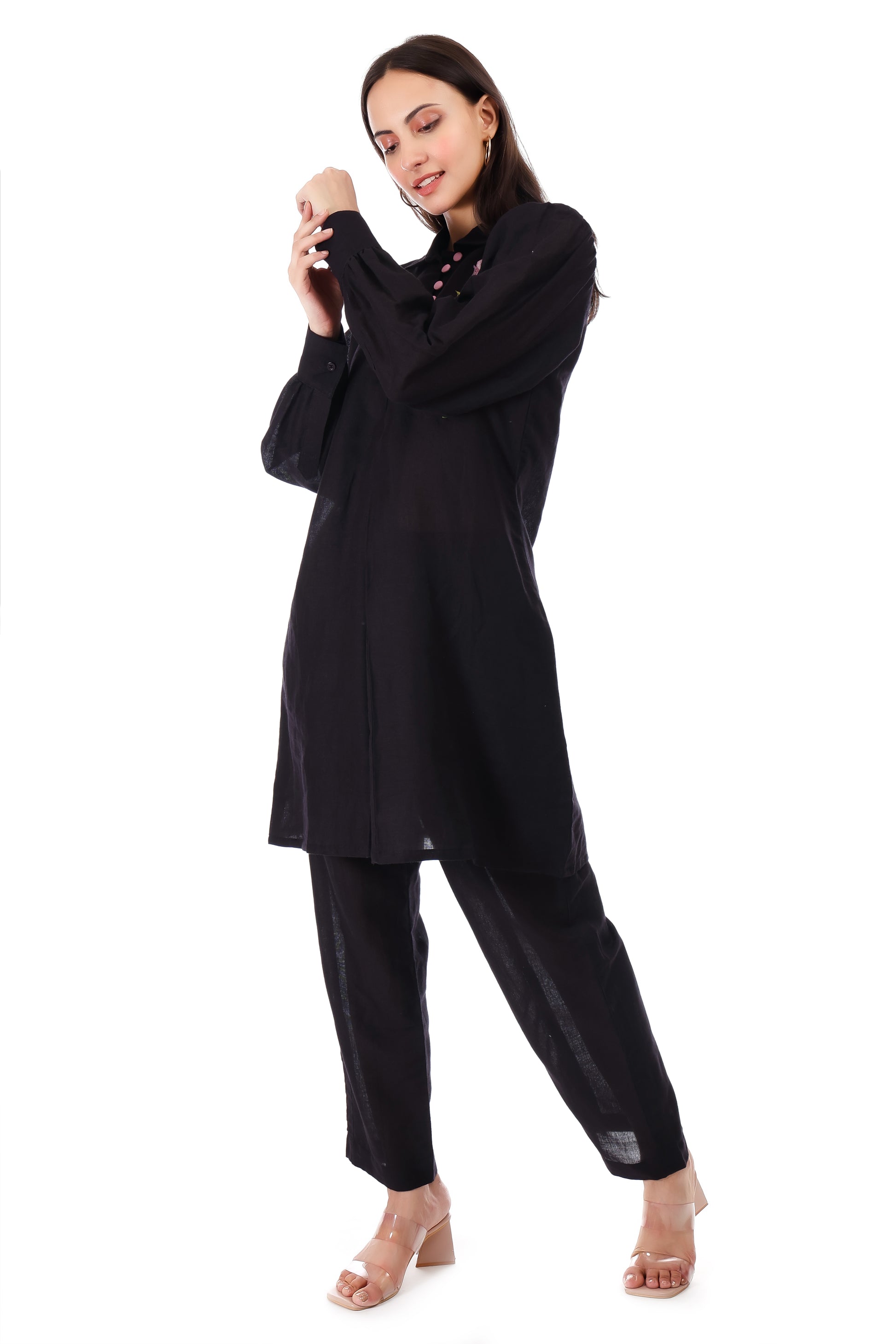 These HUEGENZ Black Embroidered Co-Ord Sets for women feature elegant pink embroidery, making them a stylish addition to your wardrobe. Crafted with high-quality materials, they offer both relaxed fit and sophistication for any occasion. Elevate your fashion game with this chic and versatile set.