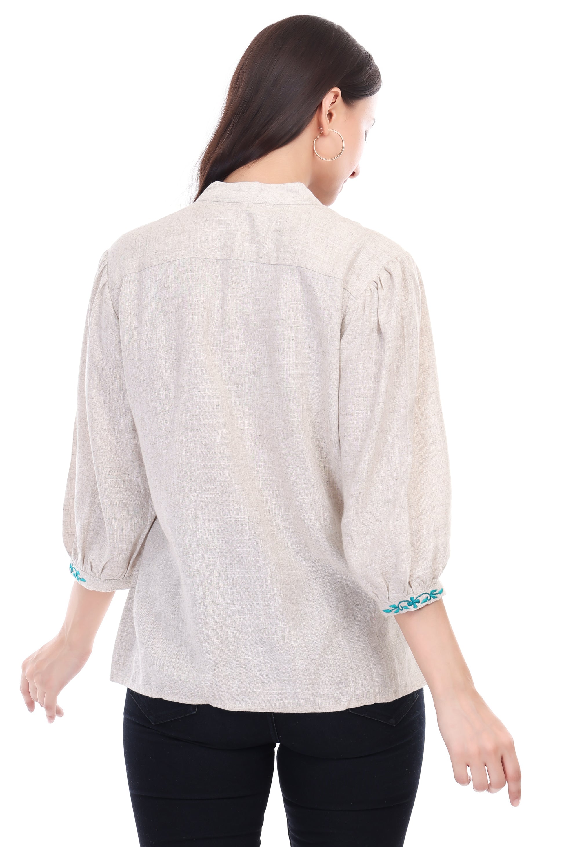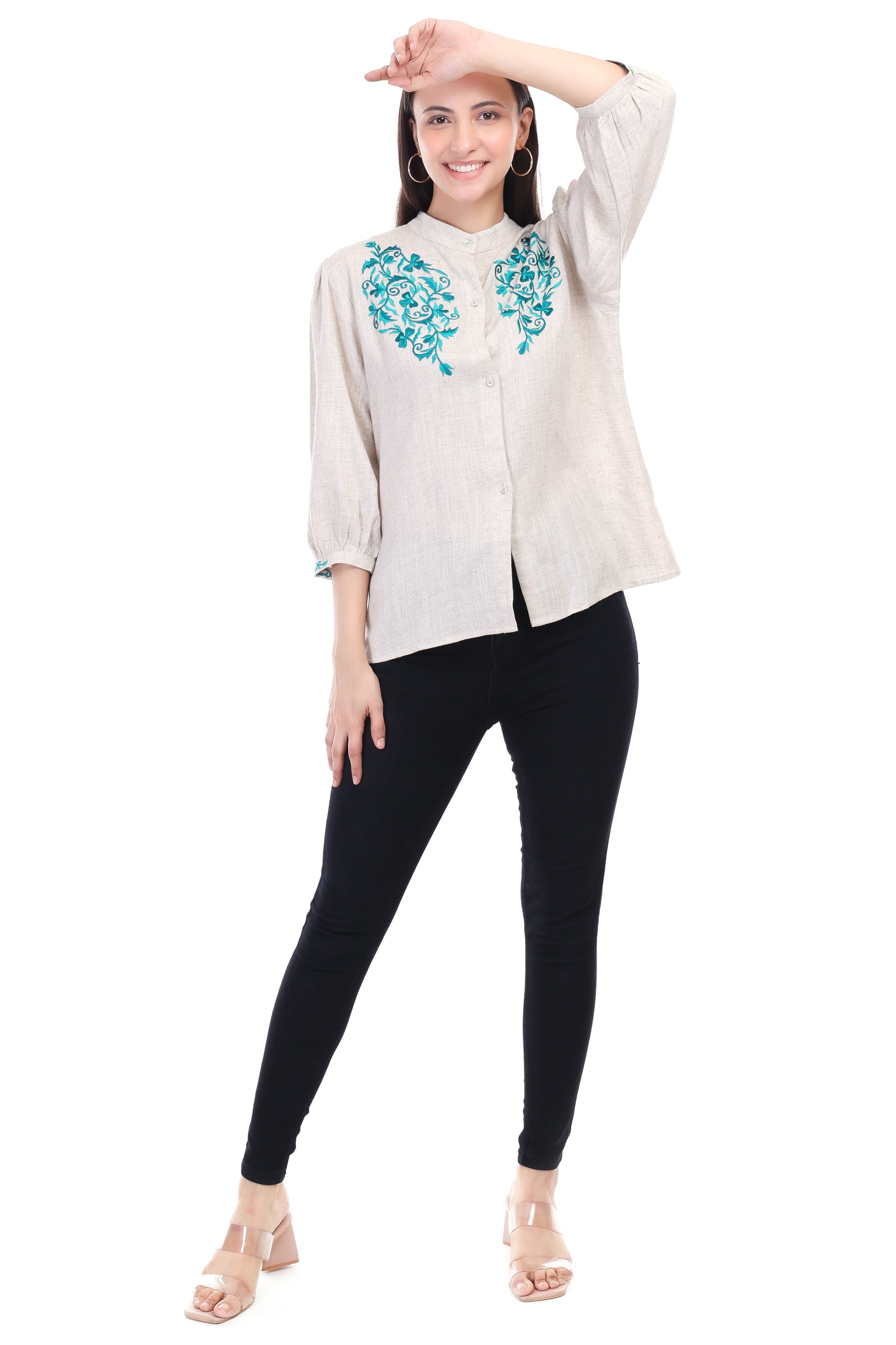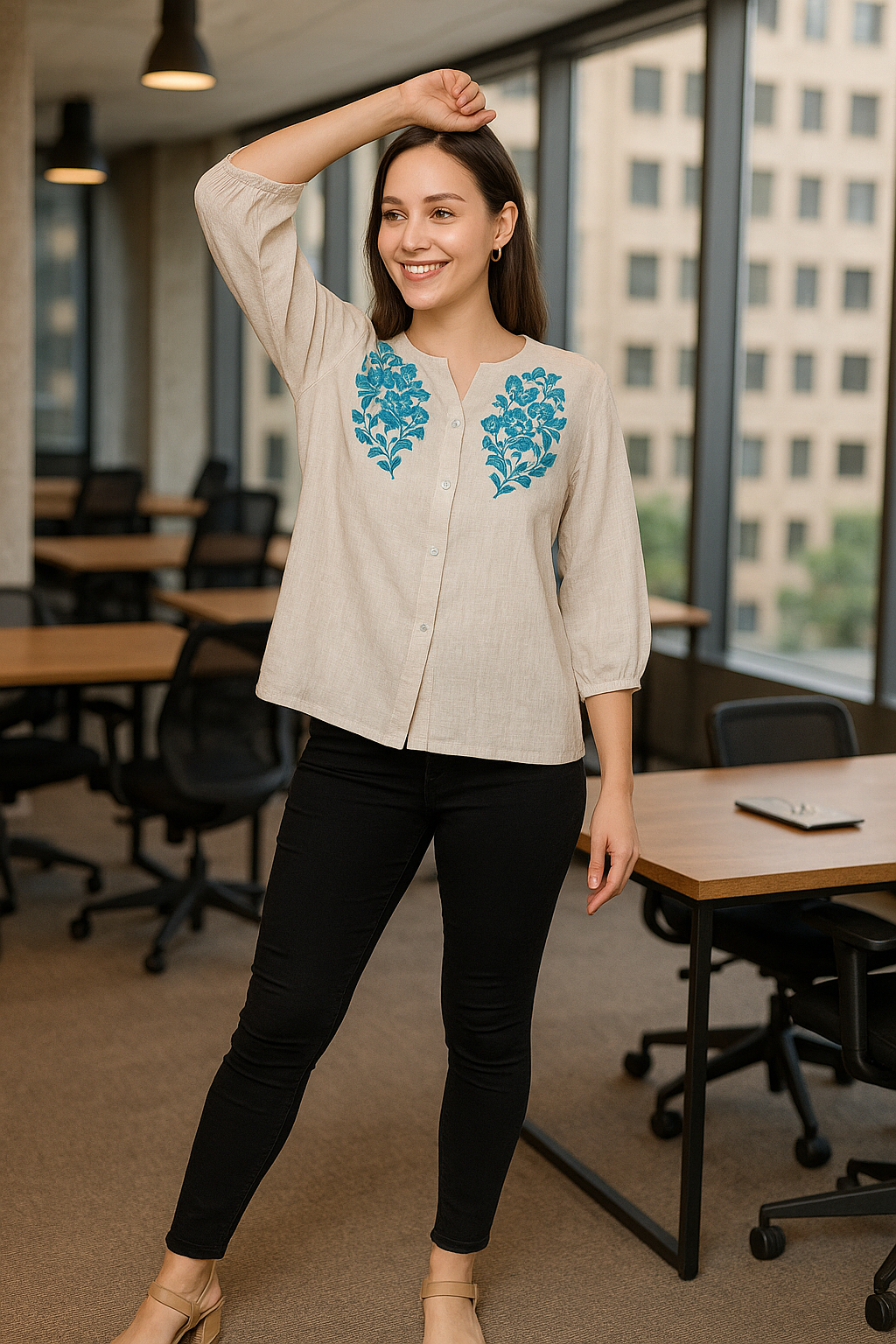 HUEGENZ Beige Women's Floral Embroidered Linen Top