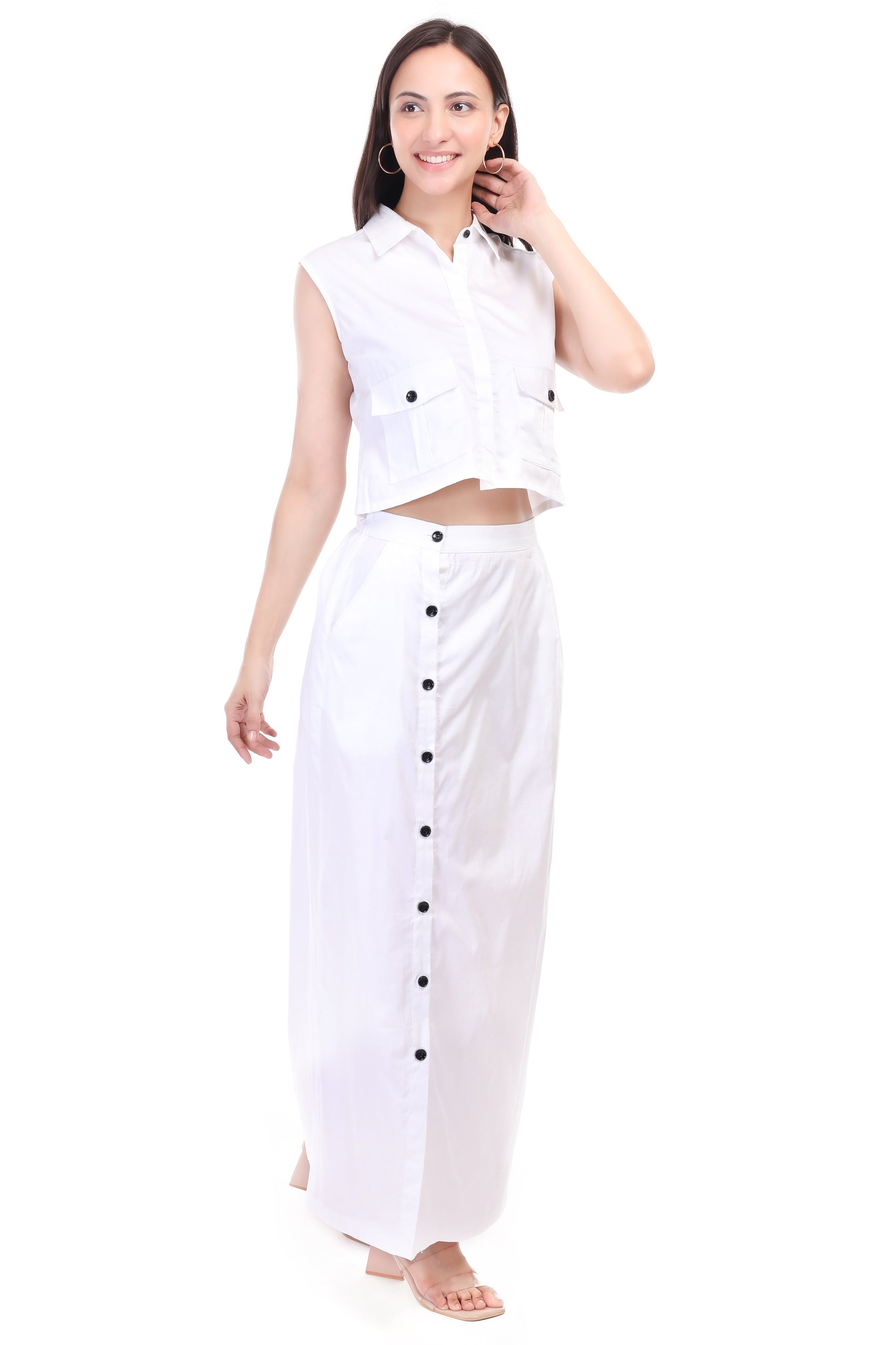 HUEGENZ Two-Piece White Cotton Set, Sleeveless Crop Top with Collar, Button-Down Maxi Skirt